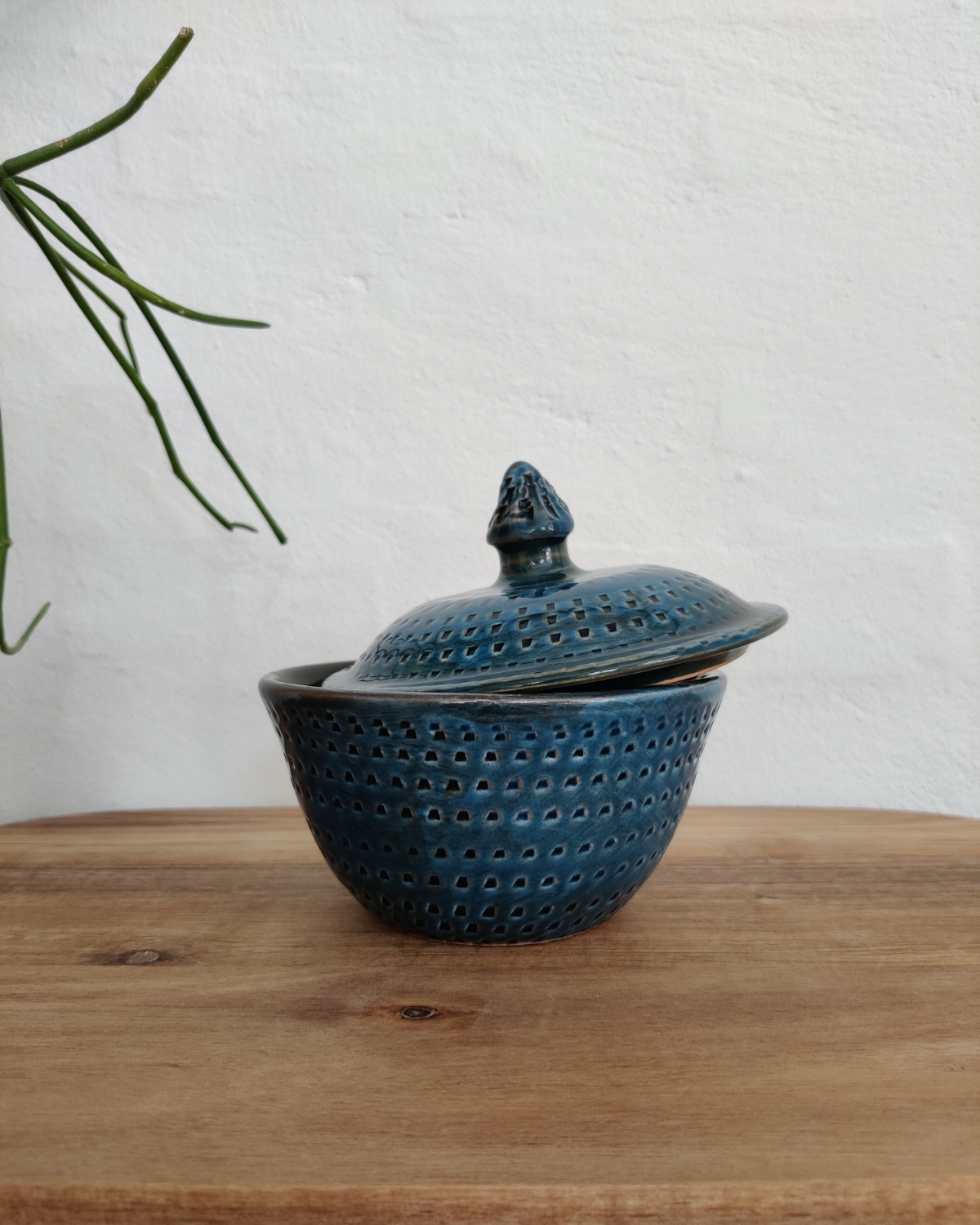 Et smukt skrin med struktur lavet i terracotta ler og med en blank glassur.