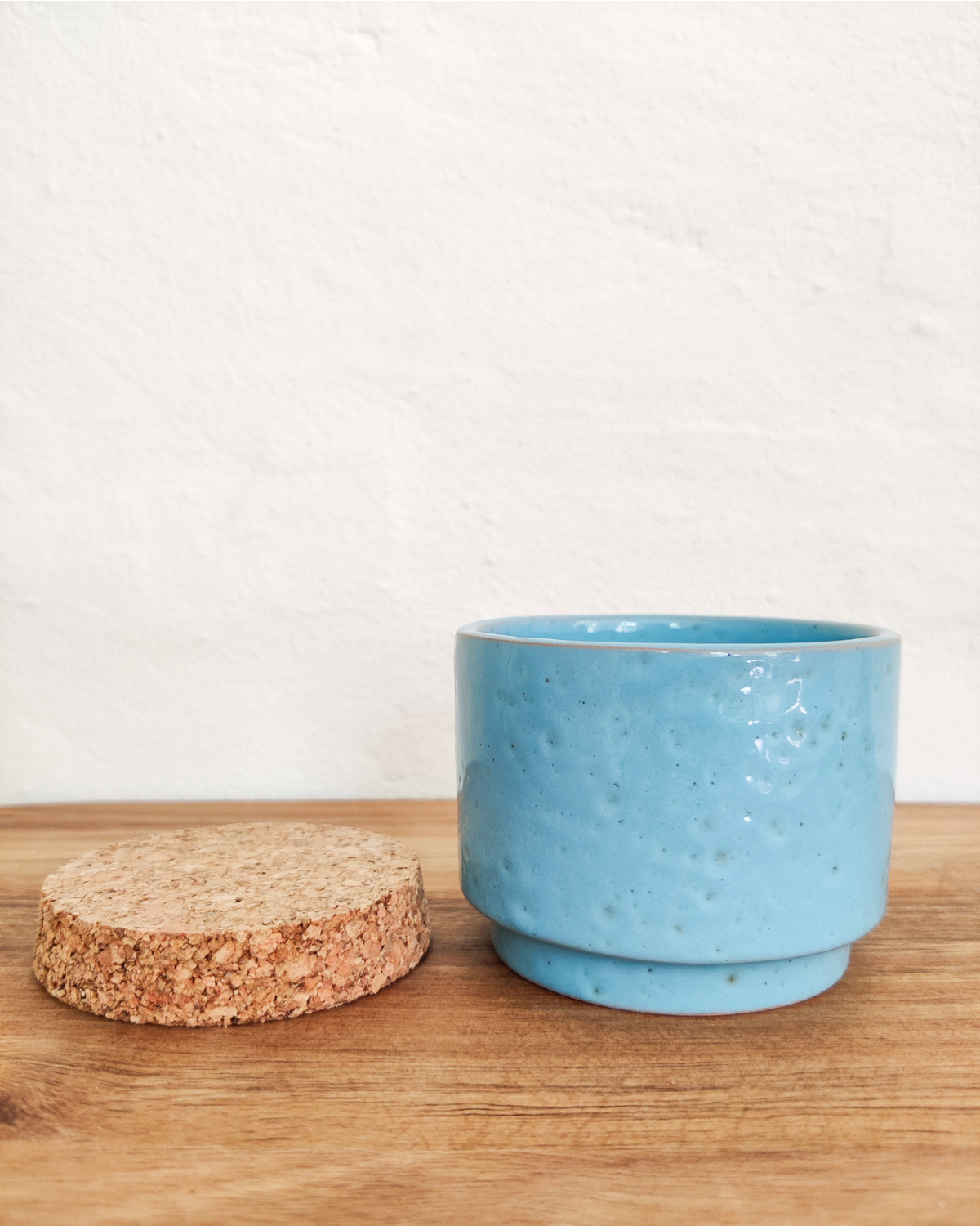 En smuk krukke med struktur lavet i terracotta ler og med en blank glassur. Låget er af kork.