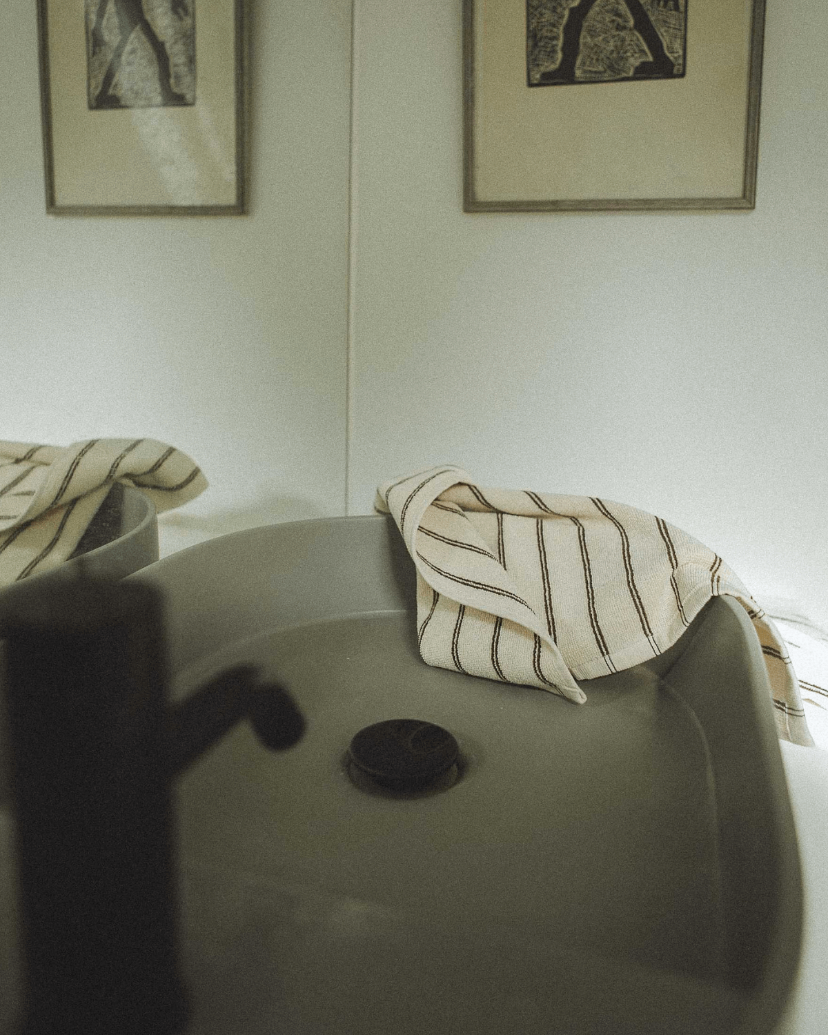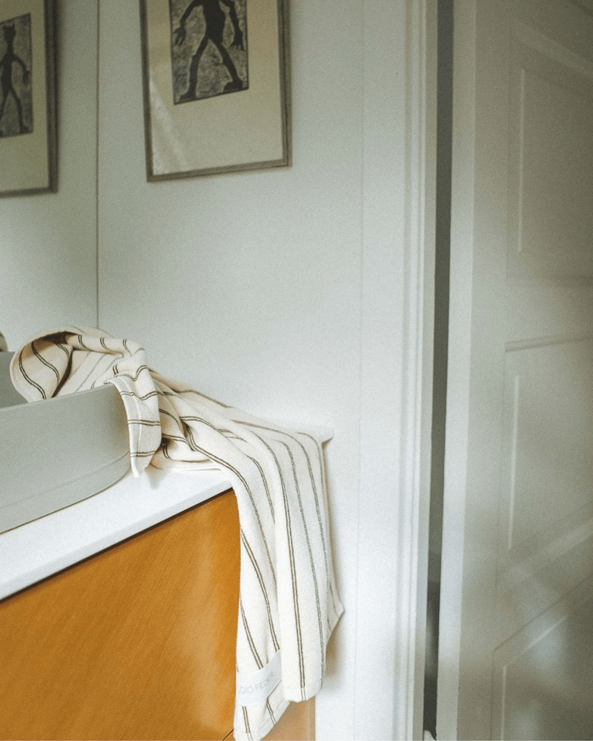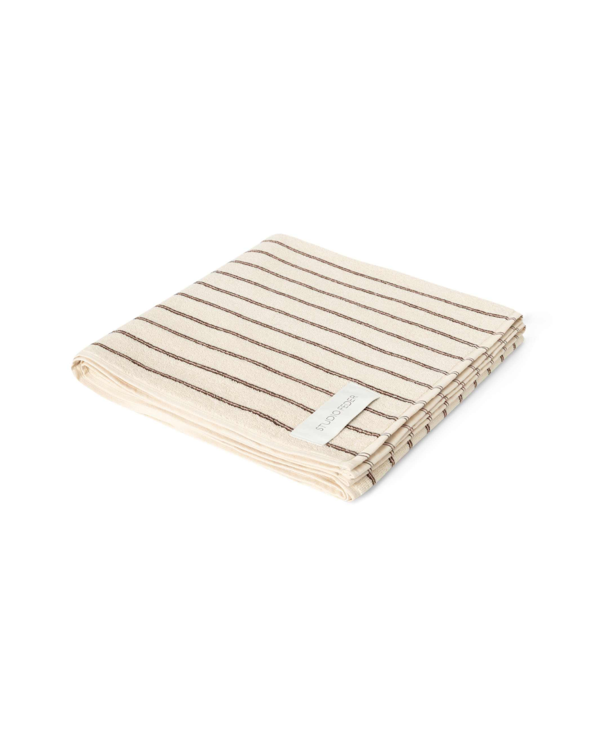 Håndklæde i økologisk bomuld med en tynd brun stribe.
