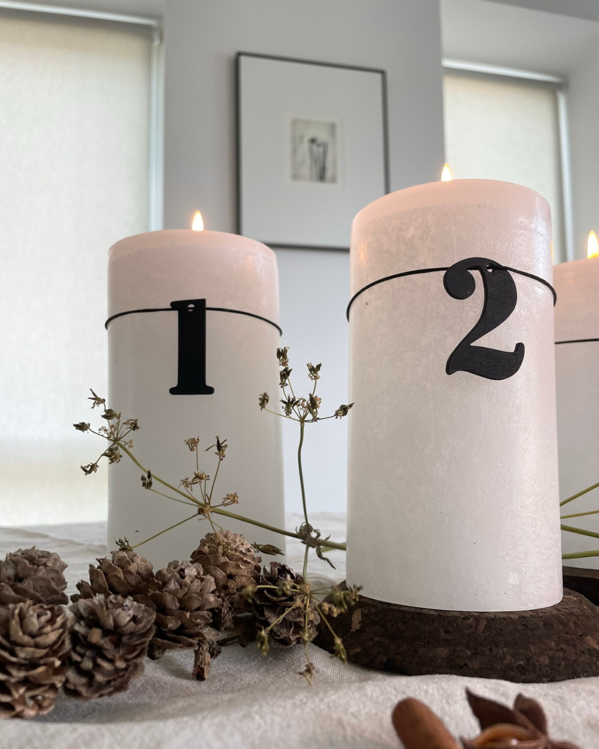 Disse flotte adventstal af overskudstræ, kan bruges igen og igen. Tallene hænger på en elastiksnor, så de kan tilpasses hvad end du hænger dem på.