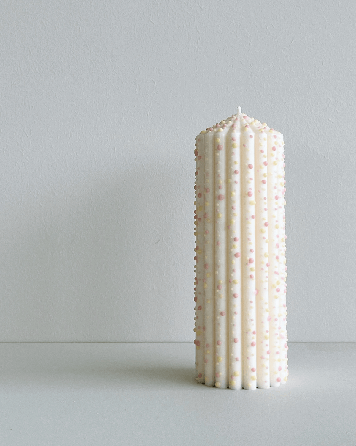 Magdalena der står bag Studio M candles støber alle hendes lys i hånden. Lysene er lavet af 100% naturlig soyavoks. De små gule og lyserøde prikker er sat på med hånden, hver og én. Obs. gnub ikke på prikkerne da de kan falde af. Dette ses ikke som en reklamation.