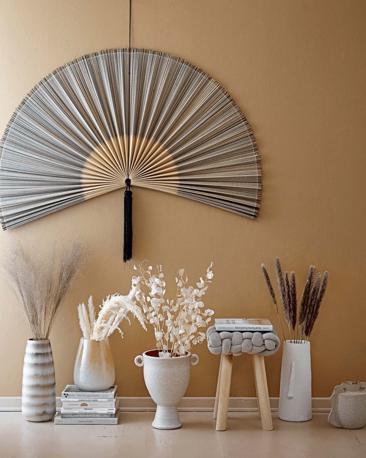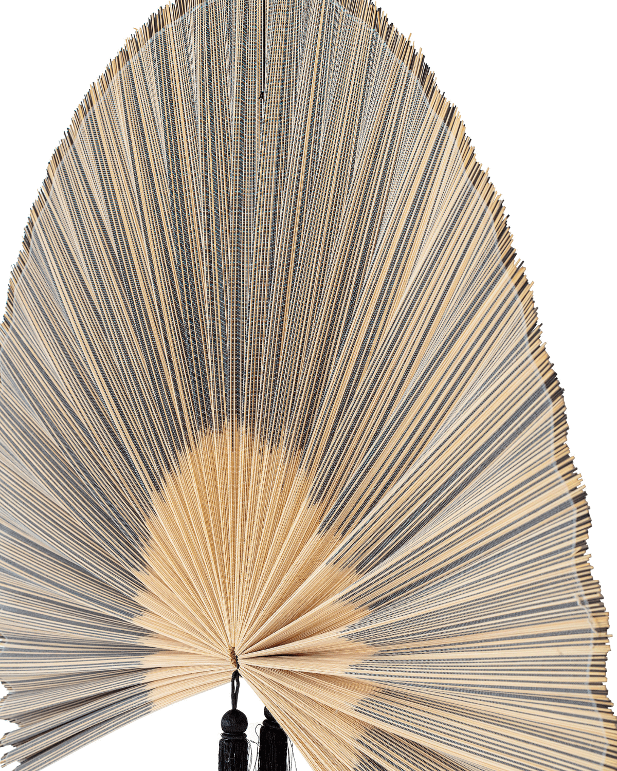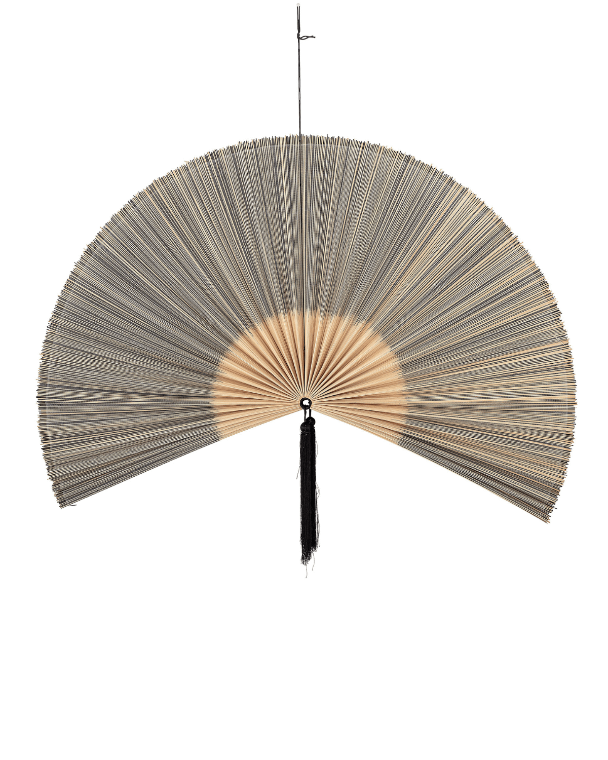 Viftens store størrelse på L145 x H110 cm gør den til et naturligt blikfang, der tilfører rummet varme, struktur og personlighed. I bunden prydes den af en dekorativ kvast, mens den sorte ophængssnor gør den let at montere.