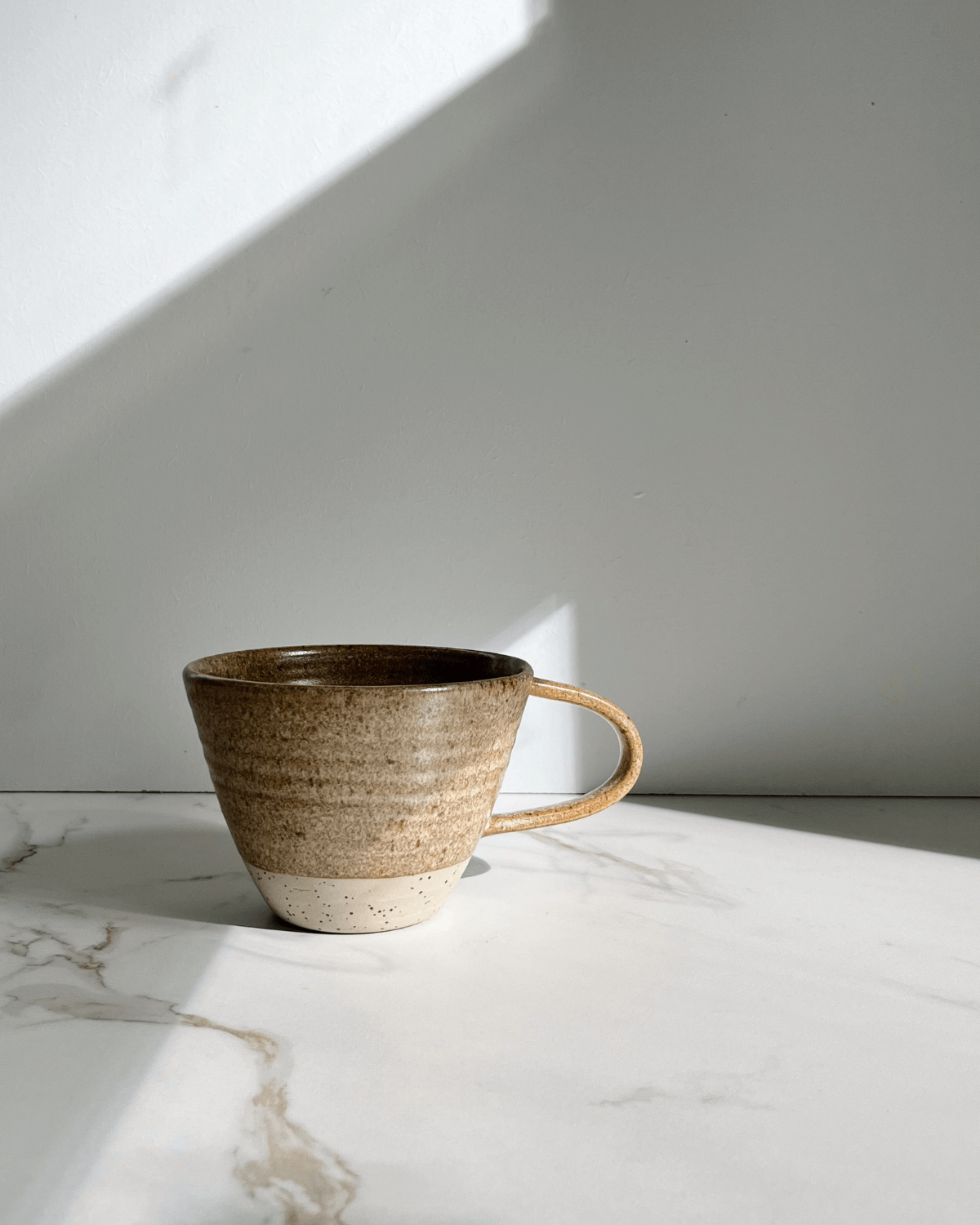Smuk hånddrejet cappucino kop med hank i creme/brun.